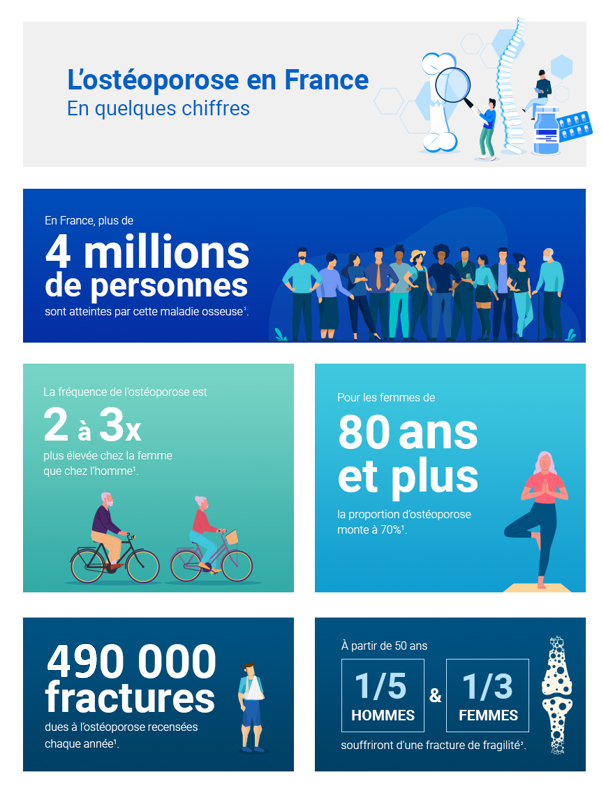 Avec l’allongement de l’espérance de vie et le vieillissement de la population, l’ostéoporose et les fractures qui lui sont associées représentent un problème de santé publique important : autour de l’âge de 65 ans, on estime que 39 % des femmes souffrent d’ostéoporose. Chez celles âgées de 80 ans et plus, cette proportion monte à 70 %1. Un chiffre qui ne cesse de progresser puisque nous estimons à 610 000 le nombre de fractures causées par l’ostéoporose en 2034.